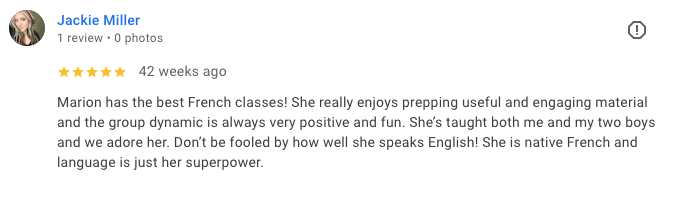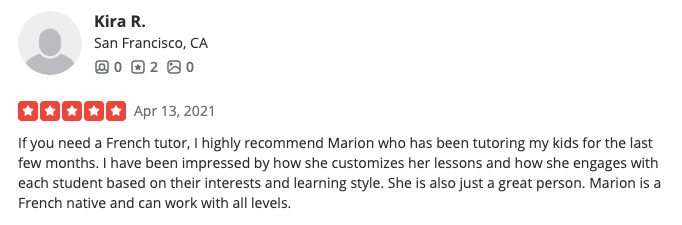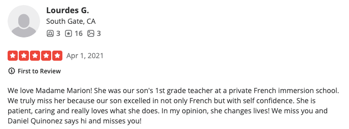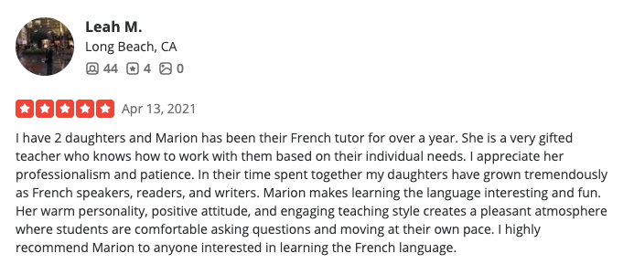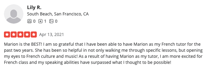 — Alex K. (Yelp)Marion makes learning the language interesting and fun… her warm personality, positive attitude, and engaging teaching style creates a pleasant atmosphere. ❞