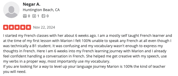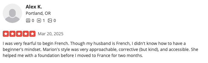 — Leah T. (Yelp)I started my French classes with her about 6 weeks ago… I already feel confident handling a conversation in French. ❞
